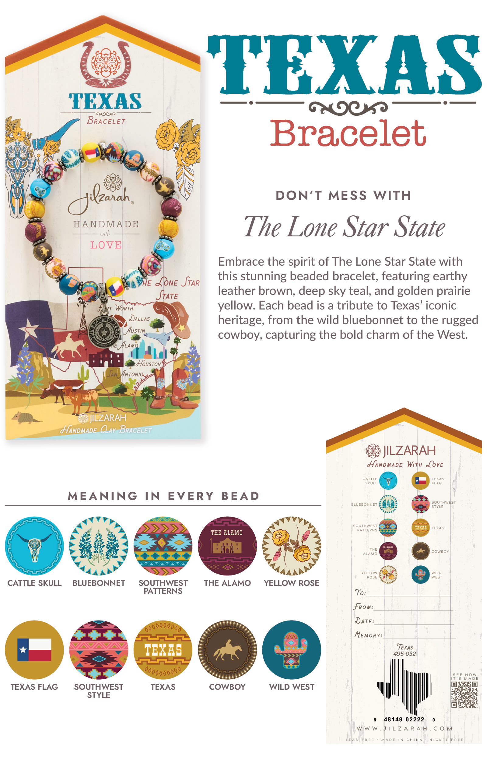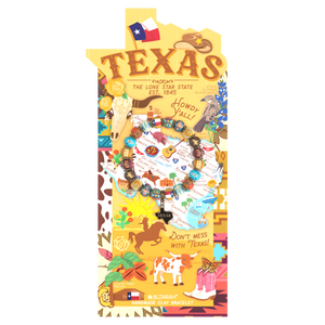 Embrace the spirit of The Lone Star State with this stunning beaded bracelet, featuring earthy leather brown, deep sky teal, and golden prairie yellow. Each bead is a tribute to Texas' iconic heritage, from the wild bluebonnet to the rugged cowboy, capturing the bold charm of the West.
