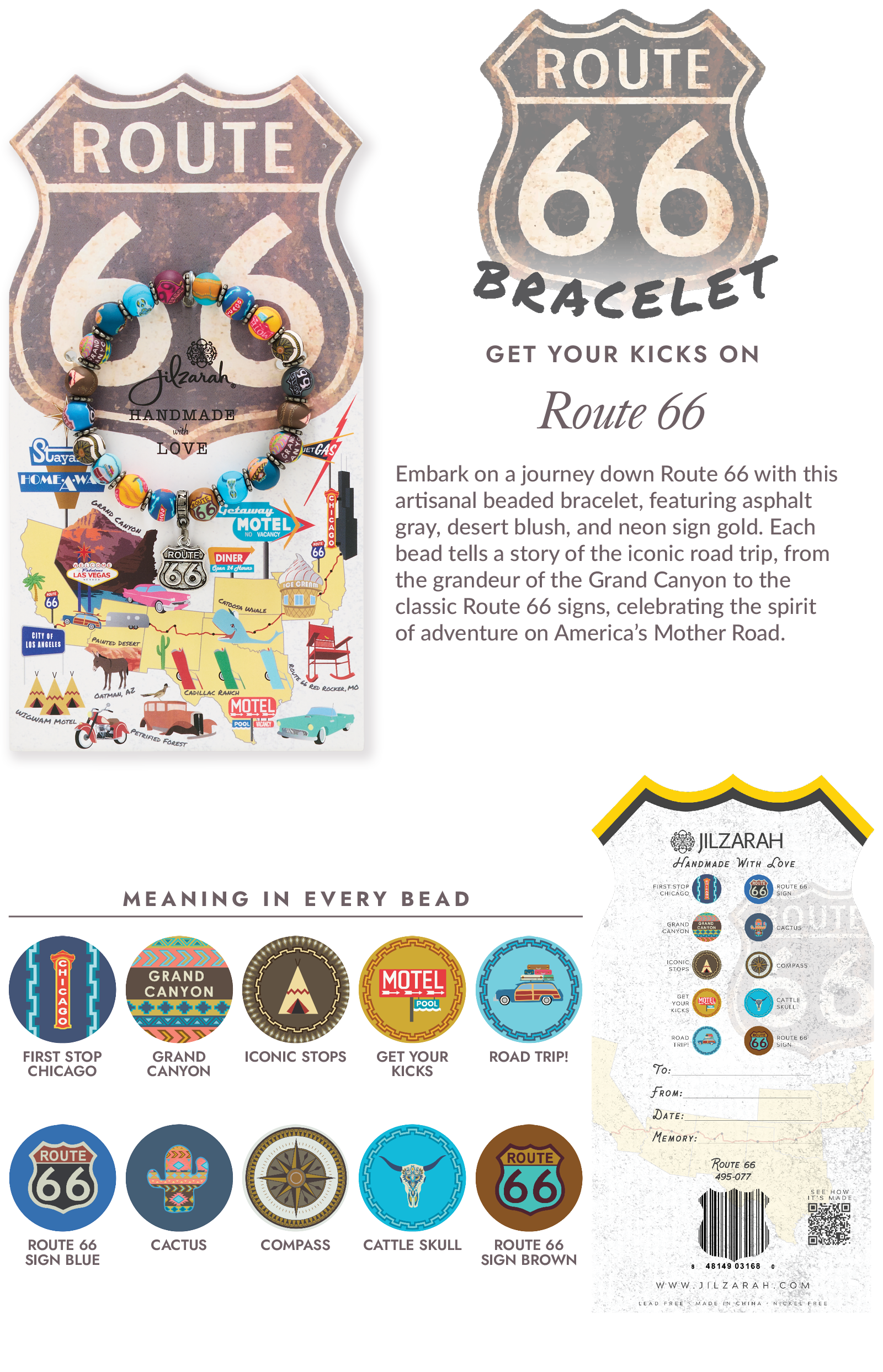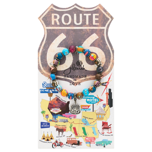 Embark on a journey down Route 66 with this artisanal beaded bracelet, featuring asphalt gray, desert blush, and neon sign gold. Each bead tells a story of the iconic road trip, from the grandeur of the Grand Canyon to the classic Route 66 signs, celebrating the spirit of adventure on America’s Mother Road.